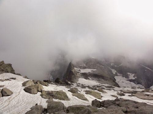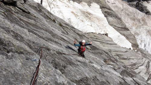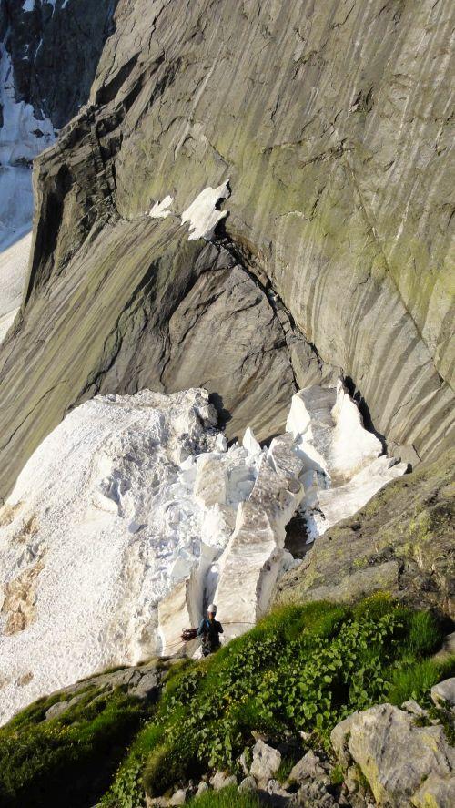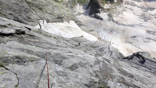 Dva kroky nahoru, jeden dolu. Traverz přes šikmé sněhy je trošku nepříjemný a také dost mokrý. Tam kde se normálně stoupá přes žulové prahy teď leží hromady sněhu. Hledání matroše co jsme sem hodili včera odpoledne, slanění do rokle, hrůzo-strašné přeskakování a prolézání sněhových bloků a jsme na nástupové polici. Davy se dnes nekonají a většina míří na severní hranu. Jsme tu skoro sami. Před námi jen naši staří známí z auta. Ti mají namířeno víc vlevo do Cassina. Cepín by se za těchto podmínek možná hodil a ušetřil pár krušných chvil na keckách, ale souboj flaška navíc versus pikle skončil ve prospěch Mullera.