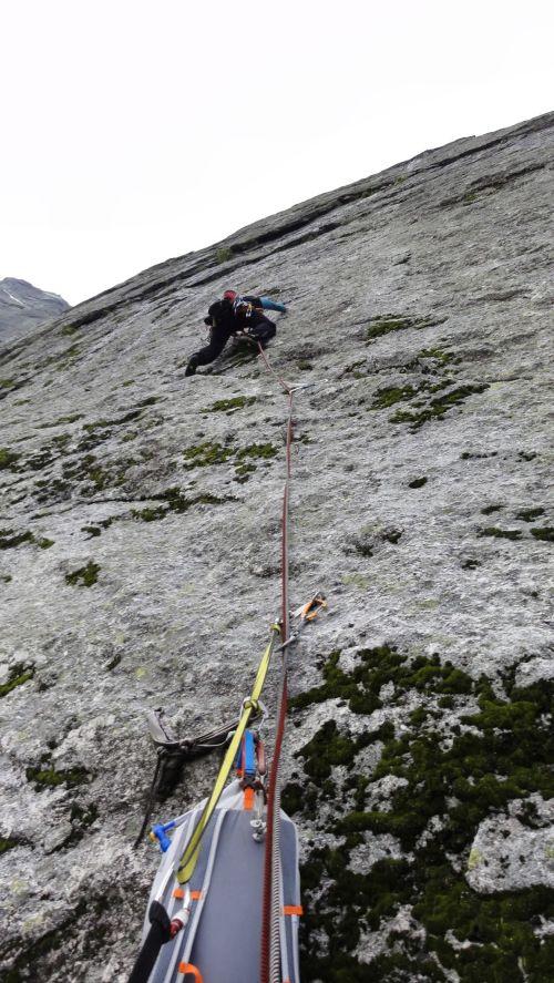 Poslední tři hlemzací délky a jsme na hraně. Není ani poledne, slunce neztratilo na intenzitě, hrana půlí prdel a dost blbě se tady sedí. Plácat se nahoru po hraně nikomu z nás nechce, zvlášť když tatranka chutná stejně dobře i tady. Prima linka a festové štandy si přímo říkají o slanění skrze cestu zpět pod nástup. Spíš co s tou hromadou ledu na polici. Po hraně to může být tak maximálně 15krát přesedat a zato horším. Nicméně lana se nám sekla jen jednou, za to padesátka dvojče mohlo být o pár metrů delší. Dole tak akorát včas. To co vypadalo tak krásně, není nyní vidět. Začíná bouřit a čas tak akorát najít nějaký dobrý placák, kam moc nepoteče. Klika, alespoň pro nás. Týpci teď asi musí zažívat v horních komínech pravý kaňonink a ačkoliv to dlouho netrvá, o to víc toho padá.