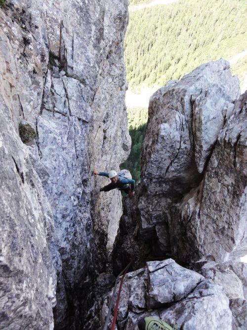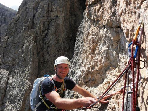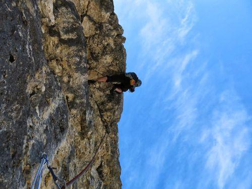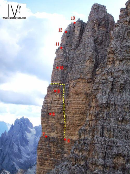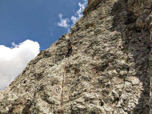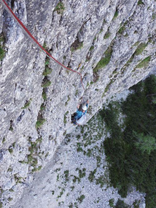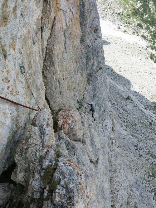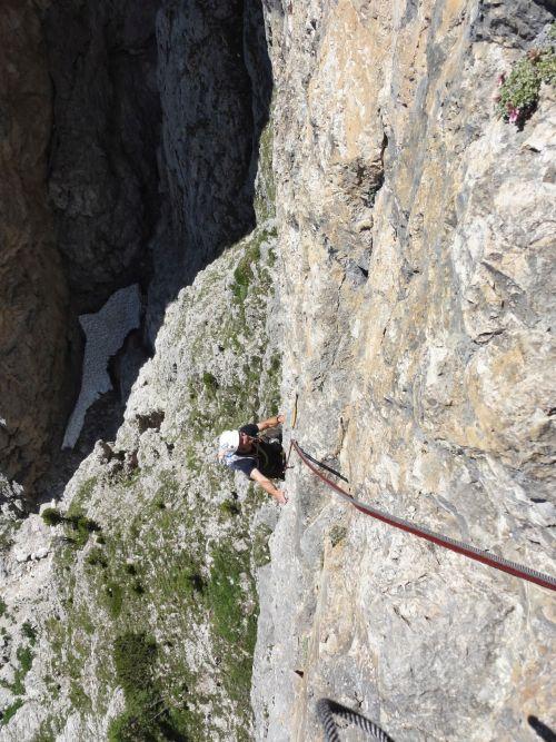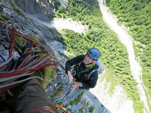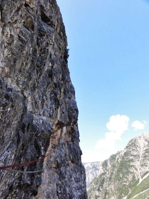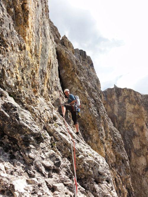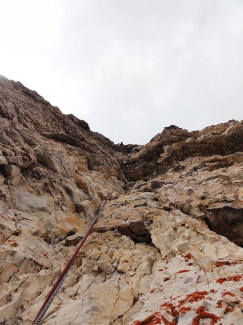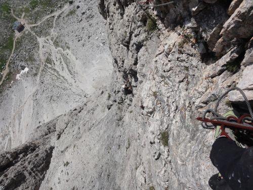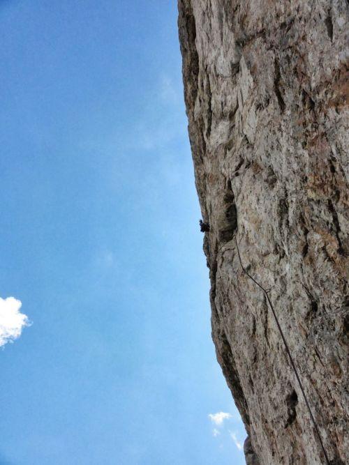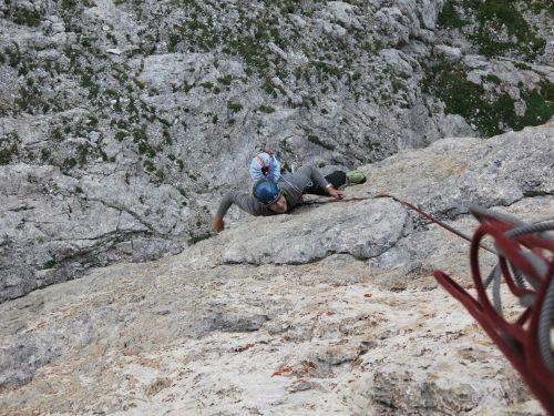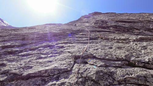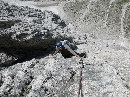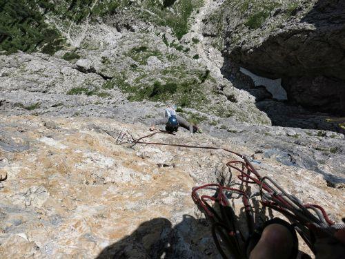 Všichni se zdají být na opačné jižní straně či ve věžích a my si užíváme samoty. Vytečkováno stěnou s parádním šedým dolomitem víceméně pořád nahoru, sem tam menší odbočka skrze chytovaté převisy. Cestou se toho dá dost cvaknout a když ne, tak to zachraňujou smyce a menší kámoši. Občas to chce trošku hledat a topo se hodí. Zdá se, že nýty se tady na rozdíl od českých kruhů nenatírají na červeno a zvláště ve vertikálách tady není směr vždy tak jasný. Kout vedle trošku mate. Chtělo by se tam zalézt, ale tudy to nevede. Prostě modernější cesty, které problémy spíše vyhledávají, než se jim vyhýbají.