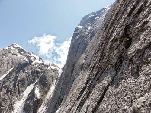 Skoro na každém štandu se dají pohodlně zout boty a vypnout do perfektních výhledů na většinu stěny. Poklopená stěna pravé části plynule přechází ve vertikály a převisy více vlevo. Tam někde vede Anglická cesta a kolem musí být slavné československé Memento Mori. Z té velikosti až přechází zrak. Cassin byl prostě klasik, když si to jen tak střihnul znovu ve svých skoro 80 letech při výročí prvovýstupu. Ohromná je koneckonců i neustálá přítomnost vody ve vedlejší části stěny, mezi kterou teď kraulujou naši švýcarští stopaři. Zatím co my jsme skoro na konci, jim pořád zbývá nahoru flák.