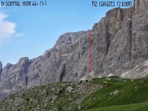 Dr.Scintilla, devět délek s nejtěžší za 7-, vetšinou za 6+ a méně. Průvodce nekecal, po rovince cestou kolem druhé, třetí a čtvrté selské věže a do půlhodiny čumíme na severozápadní stěnu Piču Ciavezes. Jó Dolomity.