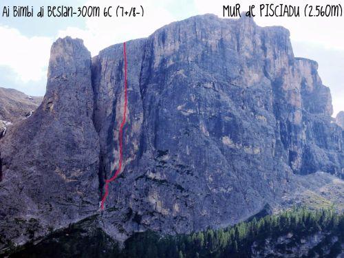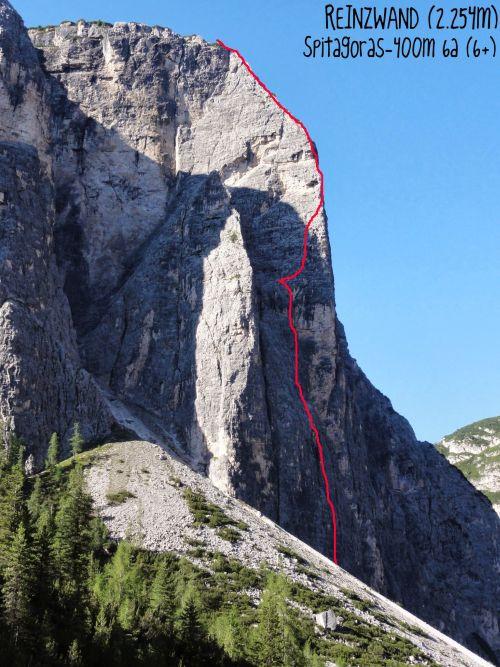 Je to přímo pod loukou u Čim, od kterých se jde pořád z kopce až pod nástup. Jediného koho tady lze tak potkat jsou turisti, co valí z Landra nahoru k rifugiu. Tak blízko k Čimám, ale přesto naprosto odlišný svět. Převládající bíložlutá se mění v zelenošedý svět, který nechává davy a žlutý dolomit nad sebou. Černá stěna s dokonalou hranou uprostřed, na kterou máme namířeno, zatím nabízí lezení ve dvou cestách, Spitagorem asi za 6+ a Velkou srandou asi 7. Víc jsem toho o tom nikde nenašel.