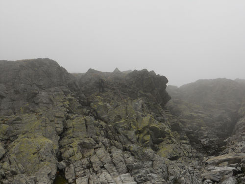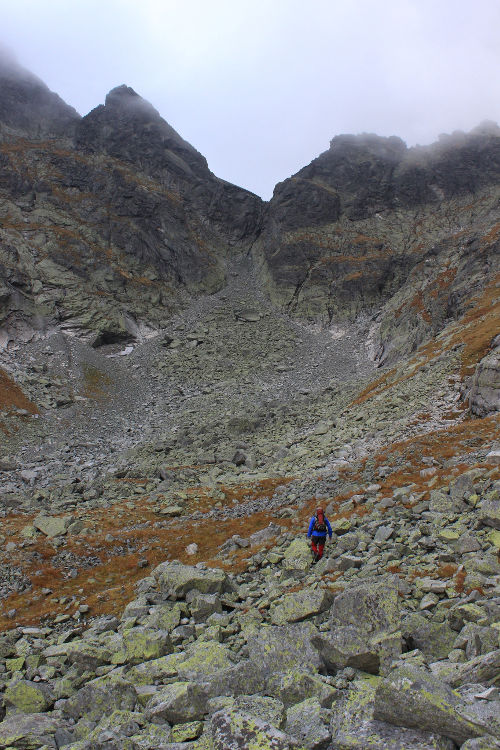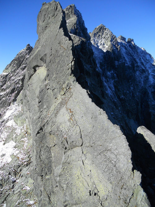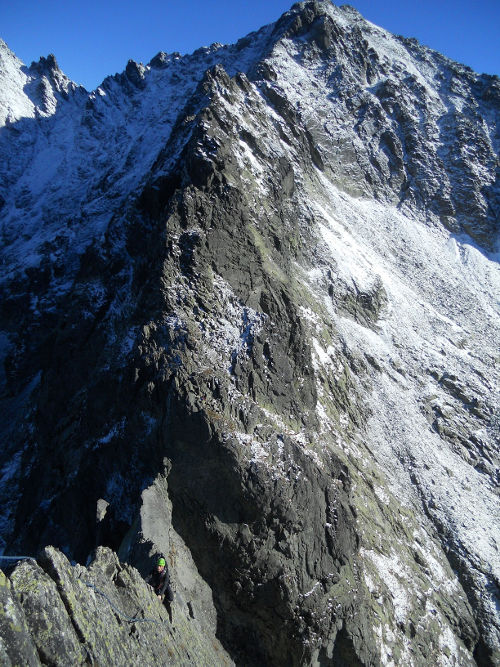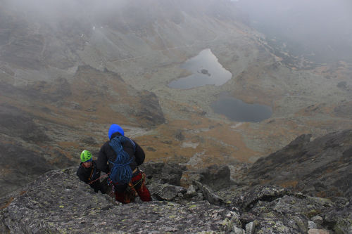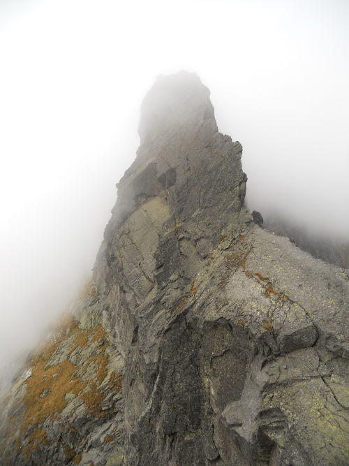 Skupinka lezců, kteří tu přišli před námi, nervózně přešlapuje na místě. "Už jsme dva razy z něho utěkali, jednou do Polska, jednou do Slovenska", hovoří jeden. "Počasí jsme si představovali trochu jinak. Ten vítr je dost silný, a jestli začne pršet ..." odpovídá můj spolulezec.