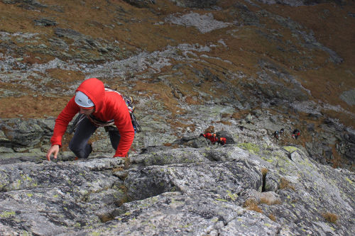 Nástup nad Žabí sedlo jsme zvládli vcelku bez problémů. Ranní procházka od zastávky na Popradském plese, snídaně u Žabích ples, trocha volného lezení, trochu jsme jistili.