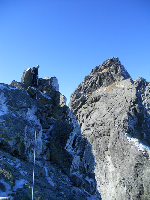Během týdne sněžilo, nástup pokrývá místy sníh místy tenká glazura. Lezeme pomalu a opatrně. Konečně stojíme nad Žabím sedlem a kocháme se fantastickým výhledem na hřeben Žabího koně.