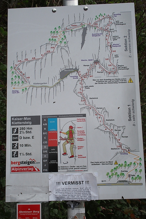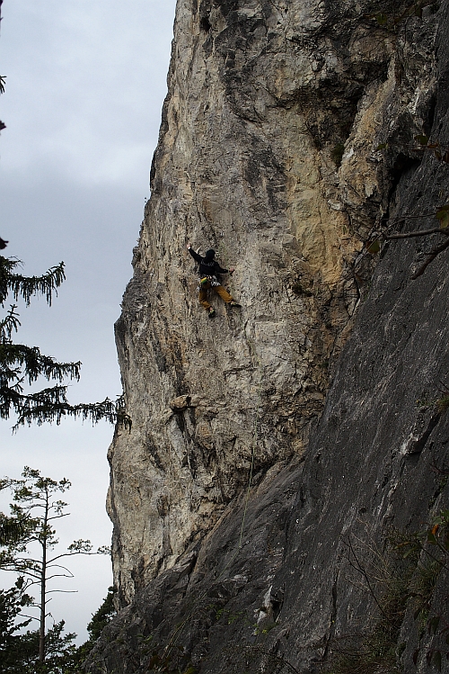 Zajímavé lezení může být také v patře nad lesíkem - sektor Grottenwegwand, kam se dostanete i ferratou klettersteig Grotte, jsou tu lehčí 15m cesty.