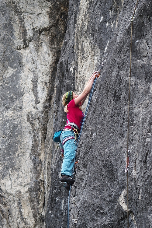 Holka leze horní délku c.Biene Mayer L2, 6c+.