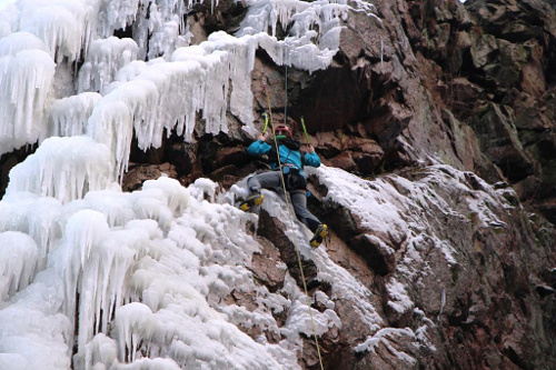 Radek tedy zasekne jako první. Kvalitu vírského ledu se chystá vyzkoušet v pátek  2. ledna 2015 dopoledne, a pokud řekne, že dobrý, tak bychom mohli v sobotu v 9:00 rozjet běžný provoz. Pokud už se na Ledovou stěnu Vír těšíte a čekali jste jenom na tuto zprávu, potom nezapomeňte navštívit hlavní informační zdroj, stránky Ledovastenavir.cz. Zde je pro Vás nezbytný rezervační formulář, kontakty pro telefonické objednání, aktuální informace o stavu půjčovny, nebo o stavu ledu. Webkamera umožní letmo mrknout, jak je ve Víru. Bude-li zima v následujících týdnech pokračovat, nabídneme Vám téměř non-stop provoz stěny, včetně večerního lezení. Dále třeba služby Hudy Mountain Guidů na rozšíření metodických znalostí.