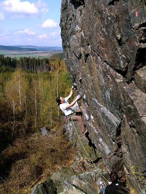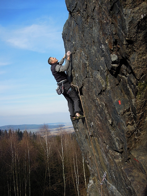 Hop boulderuje na Šumavské věži