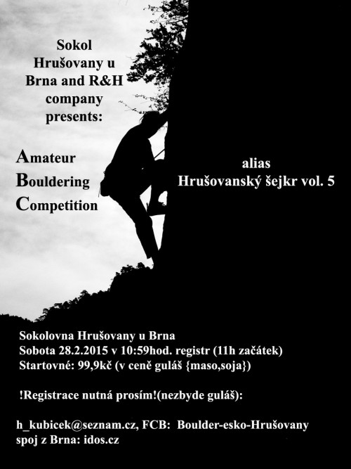 Tak jako každý rok, jsme i letos pro vaši radost uspořádali netradiční bouldrový závod na stěně v sokolovně v Hrušovanech u Brna. Tedy 28.2.2015 v sobotu od 11hod. se můžete přijít radovat. Startovné 99,9Kčs v ceně guláš, je však potřeba se registrovati se, aby sme toho nenavařili kotel a nejedli to ještě téden, což nám nebude vadit, tak dejte vědět :)