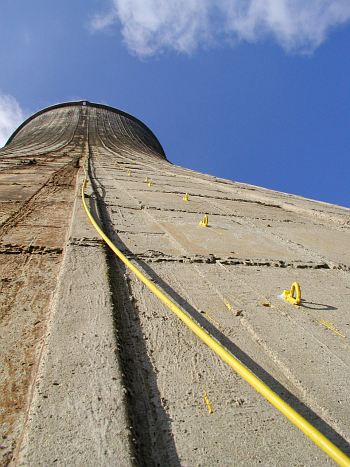 V jedné nejmenované chemické fabrice stojí krásné betonové „skalní město“, čítající tři věže o výšce 100 m a tři 60-ti metrové, pěkně vedle sebe, aby člověk nemusel moc daleko chodit, než si vybere na kterou poleze.  Ale je to v podstatě jedno, všechny jsou prakticky stejné, všechny mají totiž tvar rotačního  hyperboloidu a na každou vede jen jedna cesta (a není to výstupový žebřík!).  A to je na tom právě to nejkrásnější, protože zkuste se nějak dostat na 100 m vysoký betonový monolit, když tam není žebřík.  Ve spodní části je stěna sice mírně položená, ale postupně se mění v kolmici a v závěru přechází do mírného převisu.  Jak tedy na to?  Je to celkem jednoduché, jak už jsem zmínil, na každou z věží vede jedna cesta, tvořená linií nýtů, vzdálených od sebe zhruba 1 m, takže kdo trochu ovládá technické lezení, jistě si s tím poradí.  Musíte si ale vzít dostatečné množství karabin a nebo cvakat jen některé nýty (podle odvahy výstupce lze libovolně volit třeba každý druhý nebo pátý).