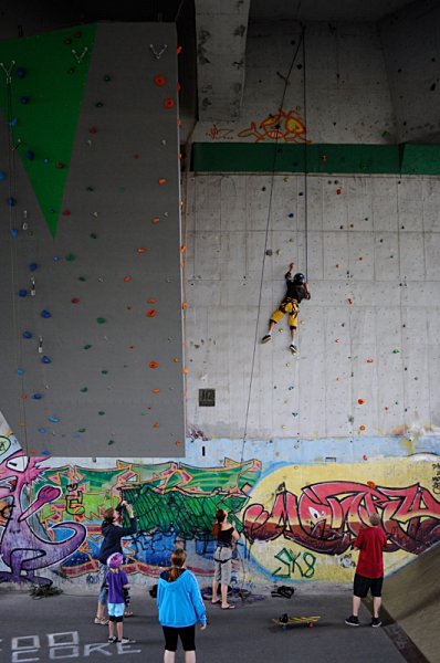 Tahle stěna má hlavní výhodu že je skoro jako skála - je pro ČHS zdarma a osoby znalé horolezectví za symbolický poplatek 100/rok. Ano není to zrovna v nejčistším místě nad hlavou ti projede tisíce aut denně a nejsou tu záchody šatny a v zimě tu protahuje mírný vánek od Labe a tudíž se zde neohřeješ, ale aspoň máme něco pro děti kterým se teď věnujeme a vychováváme si třeba budoucí vedoucí oddílu, nebo budoucí hvězdu lezení - třeba to nějakého šikovného prcka chytne tak, že až bude dělat rozhovor pro Lezce, tak řekne že začínal zde :-D