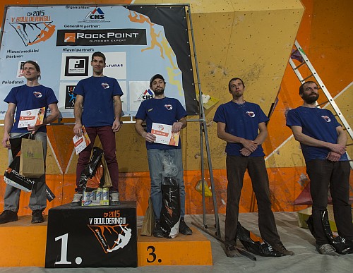 Následovala přestavba na chlapské finále, kde kluci postavili čtyři finálové bouldry z chytů značek Makak, AIX, Freestone a Flathold. S těmi se od šesti hodin popralo 12 finalistů, z kterých si nejlépe vedl Martin Stráník těsně stíhaný Honzou Chválou a Štěpánem Stráníkem.