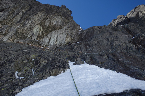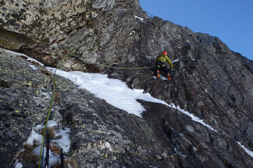 smallPočas dvoch slnečných dní 18.-19.3.2015 sme spolu s Meďom (Miro Medvec) vyliezli v juhovýchodnej stene Lomnického štítu "Michalovu cestu" 5 A4e, tak posielam krátke info a pár fotiek...