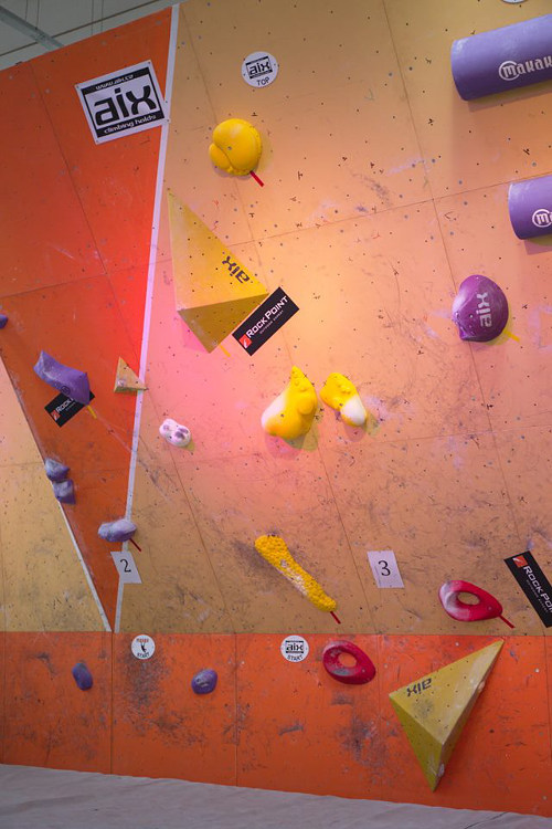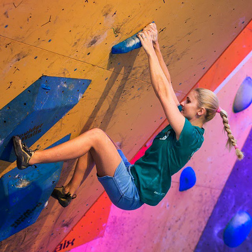 Není možné nezmínit krááásný boulder č. 4, který v kvalifikaci vylezla jen Štěpánka Šedková. Jednalo se o skok obouruč z nic moc obliny a středně dobré lišty a průměrných nohou. Tohle je něco, co já osobně netrénuju, ale cítila jsem, že to je perfektní výzva. Z deseti pokusů se mi skok podařil jednou a ten pocit byl skoro tak dobrý, jako kdybych topovala. Vyskočit, opustit obě ruce, natrefit správným způsobem dvě obliny, udržet to v zádech, v těle, rychle zastabilizovat tělo a umístit nohy, to byl opravdu super pocit. Škoda jen, že další krok do zóny už nepustil a skok už se pak ani jednou nepodařil!