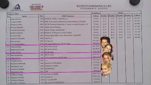 Katka Prokopová se umístila na moc krásném 10. místě a od finále ji odděloval jeden top (Káťa byla nejlepší holka s šesti topy, na finále bylo potřeba sedm). Reakce Káti najdete v mini rozhovoru dole. Eliška zabojovala taky lépe než v Lysé a umístila se na 13. místě s šesti topy na 12 pokusů. Olše skončila o dvě místa za Eliškou, taky šest topů. Vklínila se mezi nás Kačka Zímová. :) Po delší době se na ČP objevila Inka a umístila se na 19. místě se čtyřmi topinkama, plná motivace to do příště vylepšit!