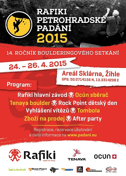 Již příští víkend za dle prozatímní předpovědi příjemného jarního počasí proběhne již čtrnáctý ročník našeho „padání“. Kolik že bude těch, kteří si odnesou nové průvodce na téměř tři stovky boulderů, kostku magnézia, kopec cen z tomboly, ale hlavně spoustu zážitků. Tipujte právě teď a tady. Jako každým rokem i tentokrát má pro Vás pěknou cenu připravena firma Ocún.