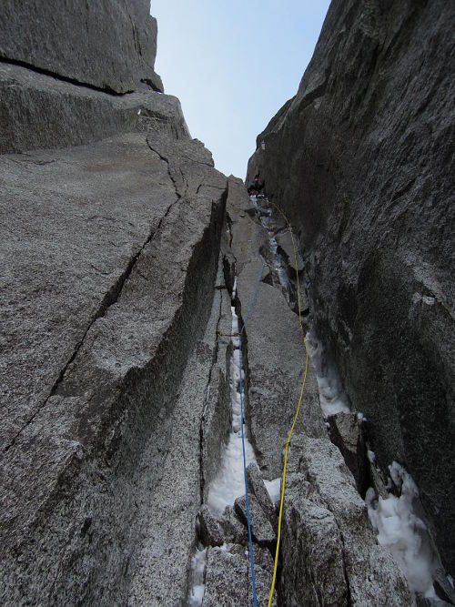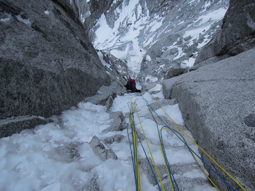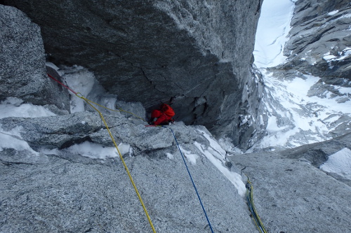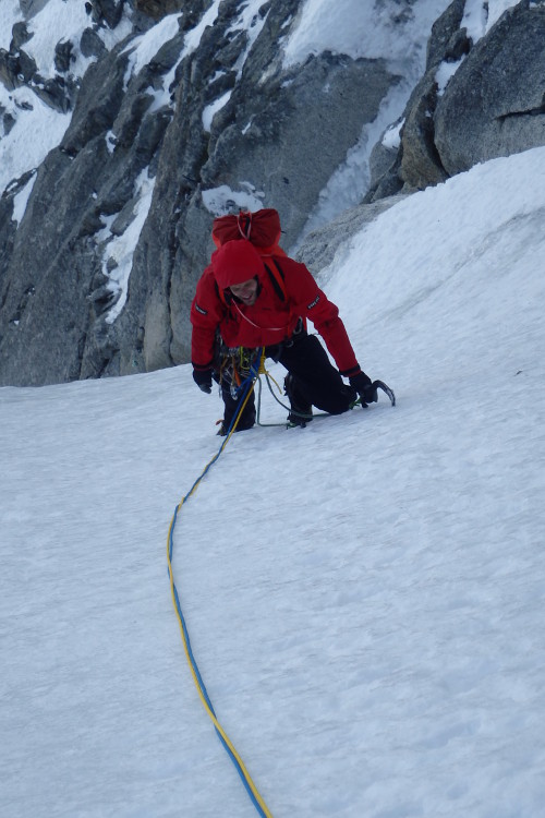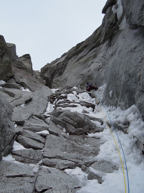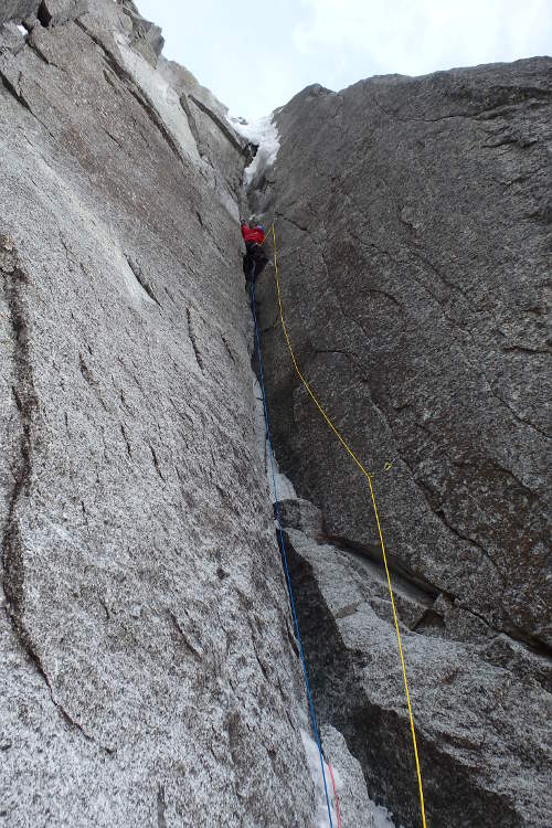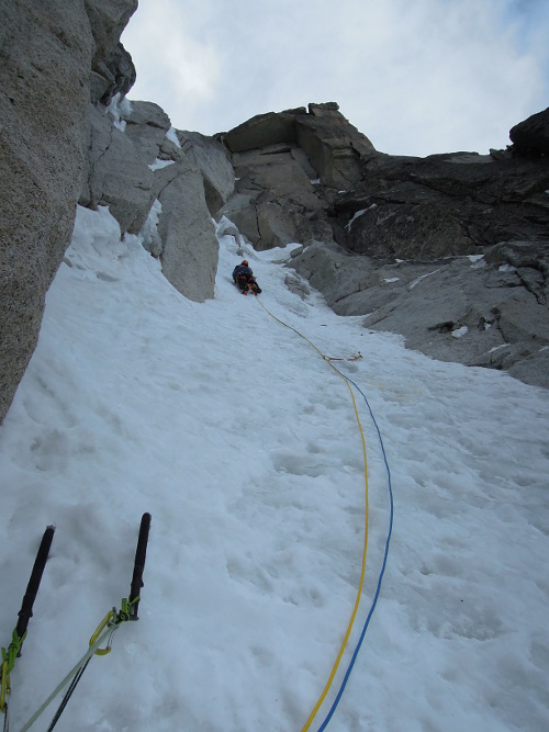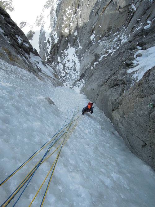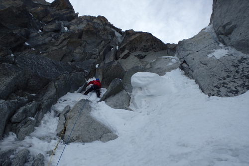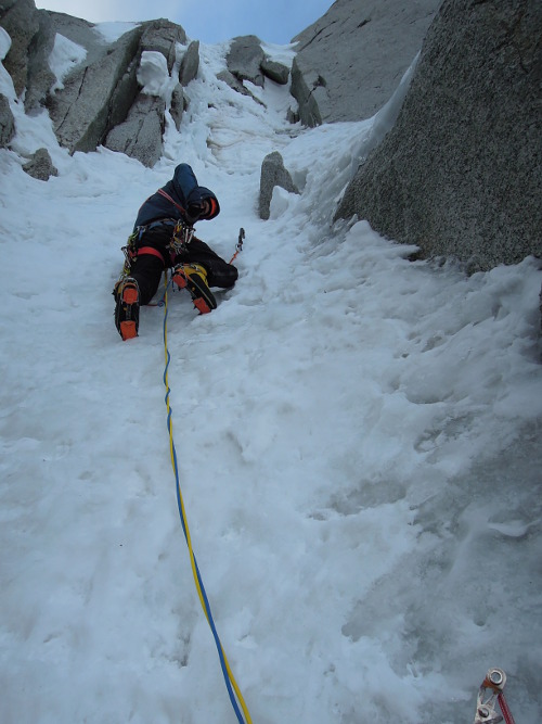 V utorok 14.4.2015 o pol piatej ráno začíname liezť cestu North Couloir - Direct M8/WI6. Prvých asi 250 m super firnu v ľahšom teréne s občasným ľadom lezieme súbežne a potom sme sa pri ťahaní striedali. Cestu sme vyliezli štýlom OS team. Druholezec liezol všetky dĺžky tiež voľne, bez odsadnutia, čo s batohom v niektorých širočinách a komínoch bolo dosť zaujímavé a ťažké.