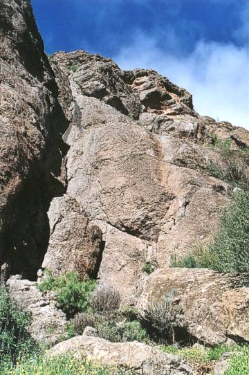Je to asi nejaka sopečná vyvřelina, ale k tomu by se asi musel vyslovit nějakej geolog.Jinak v celém kaňonu je skála pevná asi jako hodně tvrdej pískovec, nesolí ale občas je to trochu lámavé. Ale to je jen lokálně , hlavně v cestaách 9-11, kde je asi nějakej rozchrastanější kus stěny. Nejpodobnější je to Aricu na Tenerife.