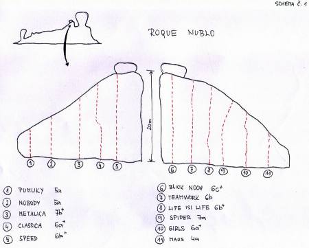 Další místo které stojí za návštěvu je Roque Nublo. Je to monumentální skalní útvar, který se stal oprávněně symbolem celé Gran Canarie. Jsou to vlastně dvě skalní věže. Ta větší je vysoká asi 60 metrů a vedou na ní delší cesty. Vedle je trojúhelníková skalní deska, vysoká tak 20 m a na ní vede asi 12 cest. Nejtěžší z nich „Metalica“ za 7b .