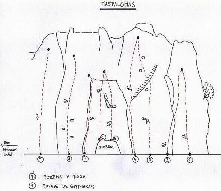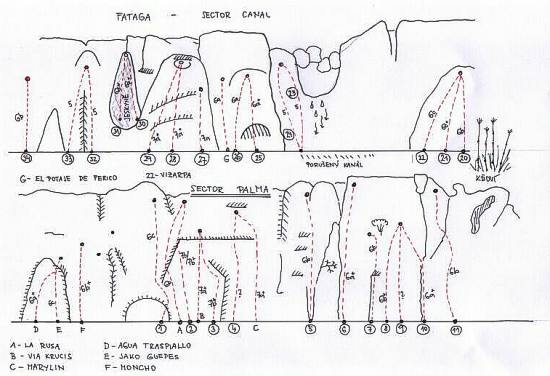 Tahle oblast se nám líbila z celého ostrova nejvíc. Je to kaňon který je v nejužším místě přehrazen hrází.První cesty začínají těsně vedle hráze takže se leze přímo pod přehradou a po tělese hráze vede po schodech velmi pohodlný přístup ke skalám. Naše prvotní euforie trochu ochladla, když jsme zjistili, že nikde není nic napsáno, žádná klasifikace, jenom tu a tam osamocenej název a nikde ani človíčka. Po bližší prohlídce jsme zjistili, že cest je určitě alespoň 50 a vypadá to, že nové stále vznikají, protože na konci jsme našli rozdělanou cestu a nějaké pomocné žebříčky, karimatky atd. Štěstí se na nás usmálo druhý den, kdy jsme tam potkali nějaké místní kluky.Snažili jsme se od nich dozvědět nějaké informace hlavně klasifkace nebo názvy. Zpočátku to ale  vypadalo, že nám vůbec nic neřeknou, všelijak se kroutili, že nevědí a moc to tam neznají. My se ale nedali odradit tak blízko od cíle. Hučeli jsme do nich tak dlouho, až nakonec vyměkli , obešli to s námi a oklasifikovali  naši primitivní malůvku, kterou jsme za tím účelem narychlo vyrobili. Nakonec jsme dokonce pojali podezření, že jeden z nich byl možná pachatel některých cest, protože se vyptával, jak se nám líbila ta nebo ona  a když jsme chválili spokojeně se pýřil. Některé názvy jsme opsali ze skály a zbývající cesty uvádíme pod čísly. Pokud se někomu z vás podaří získat nějaké další informace k téhle nové a rozvíjející se oblasti, budeme rádi, když se s námi o ně podělíte.