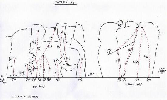 Na poslední dva dny  nám místní ještě poradili místo, které jsme měli celou dobu přímo za zády. Je to 5 km od Maspalomas a dá se tam lézt i za horšího počasí. Jsou tam lehké cesty , ale i 7a a 7b. Dostanete se tam ze silnice z Maspalomas směrem na Fatagu. Hned na konci města sjedete doleva směrem ke kamenolomu, ten objedete zprava a po 1,5km uvidíte vlevo za vyschlým korytem sklaní stěnu s cestama.
