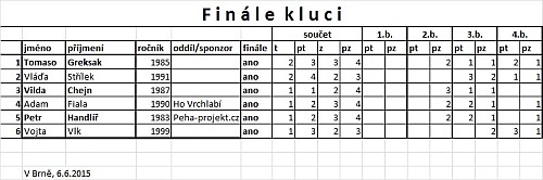 Po 19 hodině odstartovalo klučičí finále. Systém byl stejný jako u holek, tedy 3 pokusy na každý boulder. Hned ten první dal klukům pořádně zabrat a nikdo se nedostal ani do zony. S ostatními bouldry si nejlépe poradil slovenský Tomaso Greksák. Dal 2 bouldry na 3 pokusy. Za ním skončil Vláďa Střílek také se 2 topy ale na 4 pokusy. Ostatní finalisté pokořili jeden boulder. Na pokusy nejlépe dopadl Vilda Chejn, který získal třetí místo a za ním se seřadili ostatní v pořadí Adam Fiala, Petr Handlíř a Vojta Vlk.