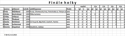 V 17 hodin vypuklo velké finále holek. Lezlo se již stylem on-sight. David s Radovanem nachystali 4 bouldry, které měli holky pěkně potrápit. Závodnice měly každá 3 pokusy na boulder. Se 3 topy na 4 pokusy zvítězila česká reprezentantka a účastnice světových pohárů Peťa Růžičková. Těsně za ní skončila také se třemi vylezenými bouldry , ale na 5 pokusů bývalá reprezentantka Věrka Kostruhová. Shodný výsledek ve finále předvedly Eliška Vlčková a Verča Šimková. Elišce tedy ke třetímu místu pomohlo vítězství z kvalifikace. Ostatní holky pokořily jeden boulder a seřadily se v pořadí Danča Kotrbová, Zuzka Leitnerová a Domča Dupalová.