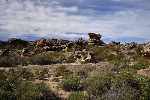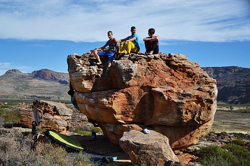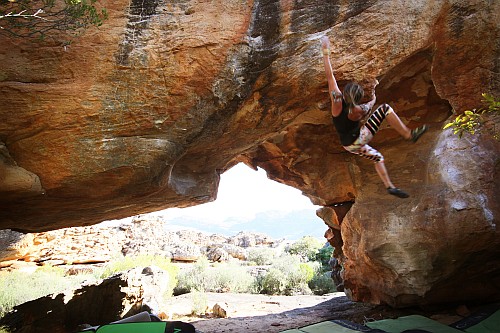Ráno nás budí sluníčko a v devět hodin se vysoukáme ze spacáků. Včera jsme si cestou nakoupili v místním obchodě, takže snídáme místní ovesné vločky s ovocem a pomalu se balíme do skal. Cestou se ale ještě musíme zastavit v kempu zaplatit poplatek za lezení (750 R/měsíc), protože se všechno lezení nachází v národních parcích. Ve dvanáct dorazíme do oblasti Close Plateau , kde se rozlézáme. Zjišťujeme, že místní písek je hodně hrubozrnný a za takového tepla nám bude brát hodně kůže. Proto se přesouváme o kousek výš do stinného Arch Valley , kde se potkáváme se Slováky (vedlejší chatku obsadilo pět Slováků ve složení Tomaso Greksák, Humpi, Renča, Braňo a Katka), kteří nám pomáhají se zorientovat a rozlézají se s námi. Do baráčku se vracíme spokojení. Rocklands nabízí krásné silové lezení, které mi trochu připomíná švýcarské Chironico a baví nás svým materiálem i obtížností.