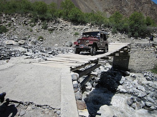 Na poslední sedmihodinový přesun jsme si najali 4x4. Na fotce překonáváme poslední most před vesnicí Phargam