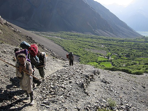 Z Chitralu lze pokračovat místními autobusy až téměř do výchozího bodu treku do BC, do vesnice Harchin. V obavě z nedostatku času jsme se ale rozhodli pro najmutí 4x4, které nás dopravilo až na konec sjízdné cesty v osadě Phargam. Přímo na místě jsme najali čtyři nosiče, kteří si rozebrali cca 100 kg vybavení, potravin, paliva a dalších nezbytností. Následovala dvoudenní cesta do BC, který jsme postavili na sutí pokrytém Gordoghan Glacier ve výšce cca 4750 m.