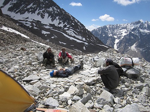 V rámci aklimatizace jsme chtěli vystoupit „normálkou“ na poměrně snadný Gordoghan Zom III , podobně jako Nikolas Kroupi během řecké expedice v roce 2004. Během prvních dní jsme v rámci aklimatizačních vycházek okolo BC došli k závěru, že v „normálce“ je málo sněhu na bezpečný průstup úvodním kuloárem a místo toho padlo rozhodnutí vyzkoušet JV stěnu, která nás měla okolo výšky 6000 m dovést na vrcholový hřeben.