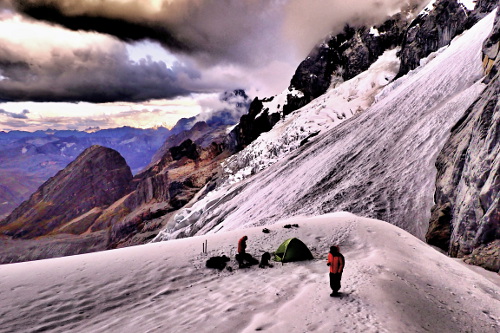 Stanley čistě přelézá převislý dvanáctimetrový rampouch s batohem na zádech a už skoro stojíme na žebru co vede k Jirishanka Chico. To by znamenalo že jsme na jihovýchodní hraně hory odkud je to co by kamenem dohodil do staré cesty. Samozřejmě nám to ještě pár délek zabere, ale s přicházejícím soumrakem se dokonce daří najít slušné místo na bivak. Ledová jeskyně po hodince kopání a sekání dokonce dovoluje, aby jsme si lehli všichni tři vedle sebe.