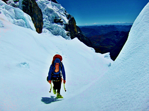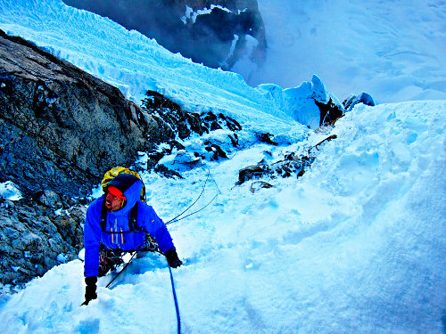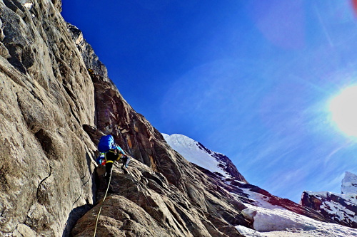 Ta už přece nemůže být tak těžká, když ji vylezli už tak dávno. Jenže "chyba lávky". Sem tam jsou tu nýty co tady nechali italové v roce 2003, dokonce jedna baterie z jejich vrtačky a občas skoba. Proč asi nazvali svou cestu "Suerte" (štěstí) pochopíme v onom ledovém kuloáru. Zhora občas přiletí lavinka osolená kousky ledu, takže se tady nikomu nechce zdržovat ani trochu.