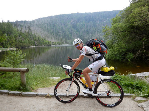 11. 6. (16.00): Zdravím od Lipna, Šumava zdolána – 90 km po rozmlácených nebo kamenitých cestách, jsem vytřesenej jak ratlík. Túra na Plechý úžasná! Zatím 480 km a 8464 m.