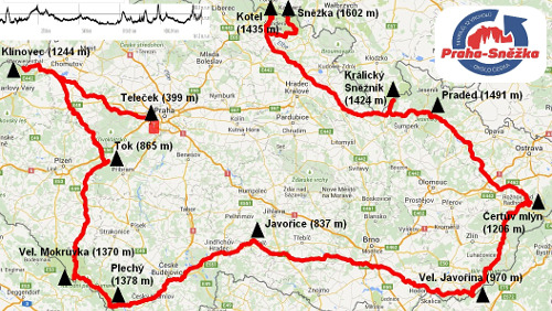 trasa ho postupně vedla přes dvanáct následujících vrcholů: Teleček (399 m) – hlavní město Praha, Klínovec (1244 m) – Ústecký a Karlovarský kraj, Tok (865 m) – Středočeský kraj, Velká Mokrůvka (1370 m) – Plzeňský kraj, Plechý (1378 m) – Jihočeský kraj, Javořice (837 m) – Vysočina, Velká Javořina (970 m) – Jihomoravský kraj, Čertův mlýn (1206 m) – Zlínský kraj, Praděd (1491 m) – Olomoucký kraj a Moravskoslezský kraj, Králický Sněžník (1424 m) – Pardubický kraj, Kotel (1435 m) – Liberecký kraj, Sněžka (1602 m) – Královéhradecký kraj. Kromě zmíněných čtrnácti krajů navštívil také území všech našich sousedních zemí: Německo, Rakousko, Slovensko a Polsko.