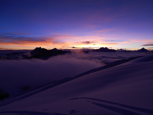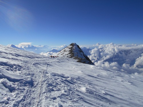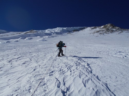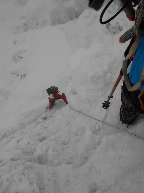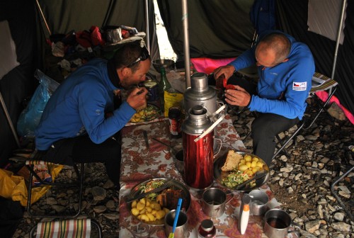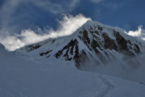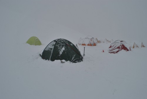 4:00 kašička, vyrážíme. Jsem zvědav jak mi to půjde, jestli to dám. Jdem kolem horní jedničky, stany namrzlé, je to jako na hřbitově, posvátné ticho. Jsme úplně sami, stoupáme křupajícím firnem. Jde mi to. Kolmý výšvih si užívám. V C2 jsme po 4 hodinách. Vaříme, klábosíme, plánujem další výstupy. Začíná sněžit. Ve 4 se vracejí šerpové z fixování do C3, spadla tam lavina. Stále sněží. C2 není dobré místo kvůli lavinám. Z BC nám hlásím předpověď a radí sestoupit. Cesta do C3 je neprůchozí, V 19:00 se rozhodujeme k sestupu. Stále hustě sněží, lepší sestoupit. V C1 jsem za 60min, celkem to šlo, jen párkrát jsme slyšeli nad námi dunění padajcího ledu nebo laviny, nepříjemné. V 11 jsme v BC. Dobré rozhodnutí.