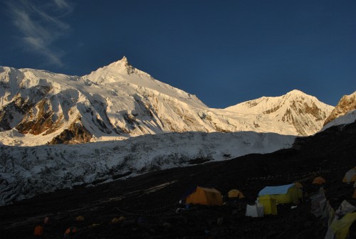 Sestup do Samagonu. Neuvěřitelné výhledy. Manaslu – sledujeme celou výstupovou trasu. C1 už 8 stanů. Cesta ledopádem peklo. Klídek, zítra výstup do BC. Nabíjím foťáky. Je tu dost expedic. Poslední wifi. Podle počasí má o víkendu sněžit. Těším se, ale mám velký respekt. Ta hora je nádherná. Tomáš má narozeniny – dort, mňam. Dal bych si maso.
