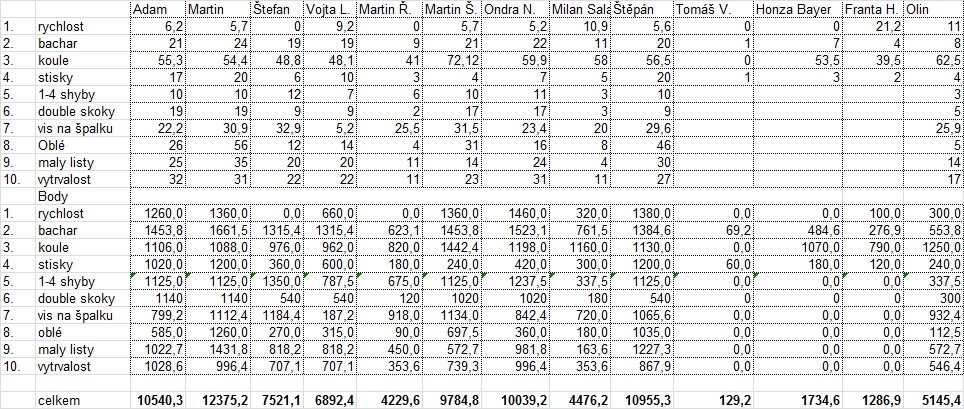 Jak říká Adam, vymysleli si ho kluci k zatraktivnění tréninku. Inspirovali se atletikou, dali dohromady 10 disciplín, silových a vytrvalostních, vytvořili bodovací systém a desetiboj byl na světě. Bylo to svým způsobem motivační a čas od času takto trénovali. Udělat z toho exhibiční závod a zapojit i veřejnost napadlo Pepeho minulou zimu a první veřejný desetiboj se na jaře uskutečnil v Ostravě. Druhý, stejně tak úspěšný, proběhl tedy v prosinci v Brně.