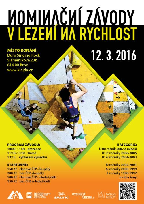 V sobotu 12.3. 2016 pořádáme na DURU v Brně ve spolupráci s ČHS nominační závody v lezení na rychlost a závody dětí v lezení na rychlost. Srdečně zveme závodníky, fanoušky a lezeckou veřejnost.