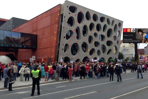Zbytek již byl dílem několika hodin, kdy se u budovy Nového divadla srocoval lezuchtivý dav a se zatajeným dechem sledoval montáž nových cest. Kaňkou na tomto osazení byl jen fakt, že po dvou hodinách práce byl odveden městskou policií zdejší vrchní stavěč, neboť se ze stavebního odboru doneslo, že azbest na konstrukce staveb prostě nepatří.