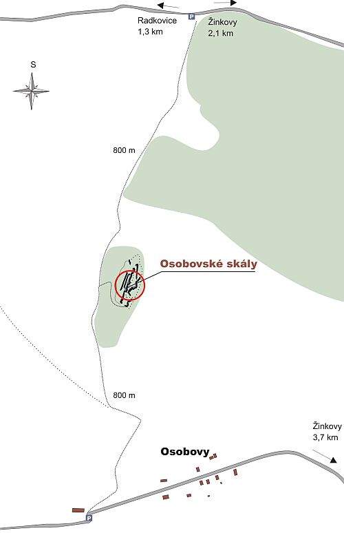 Ze Žinkov po silnici na Klatovy a na první odbočce zahneme doprava na Osobovy, kde na konci vsi zaparkujeme u JZD. Jdeme doprava (velká hospodářská budova po levé straně) po polní cestě směrem na Radkovice. V místě kde se polní cesta rozdvojuje, pokračujeme vpravo do svahu k již viditelné skále. Nebo lze ke skále dojít i ze silnice spojující Žinkovy a Radkovice..