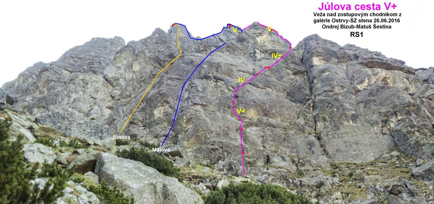 Do tretice, nech to sedí, Júlová cesta V+. Pridali sme prelez ešte jednej cesty v SZ stene Ostrvy. Cesta je pre menej náročných a je čiastočne odistená. Nachádza sa v SZ stene Ostrvy vedľa Májovej cesty a skladá sa z troch dĺžok.