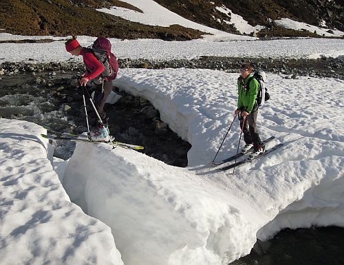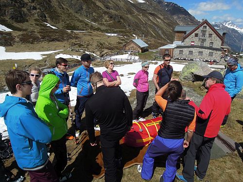 Stran teoretické náplně zimního běhu, není nic snazšího jak obsah najít na stránkách Rakouské společnosti horské medicíny. Nosnými tématy byla zejména výšková nemoc a lavinová problematika, dále podchlazení, omrzliny atd. Stran praxe skialpové túry na okolní kopce. Bohužel program není nastaven tak, že by byl člověk každý den na túře. Ani tomu tak nemůže být. Začíná se v sobotu a končí se v pátek. Slušná nalejvárna! Přednášek je opravdu hodně, dopoledne, odpoledne, večer a pokud bylo, jako že bylo hezky, sedět a poslouchat teorii a koukat na blankytně modrou oblohu a okolní hory byl dost velký opruz! Některé přednášky mne hodně oslovily, jiné méně. Oslovily mne ty, které měly pro mne jednoznačný praktický dopad, z lektora čišela praktická zkušenost, prostě to nebyl teoretik žvanil, ale něco jsem si odnesl. Za vším stojí profesor Franz Berghold jako lékař a vůdcům na kurzu šéfoval legendární Klaus Hoi, pojem to v Tyrolsku. Dlouhé roky zkušeností v oblasti lavinové problematiky a pohybu na lyžích ve volném terénu. Mojí skupinu měl na starost asi 50-letý Hans Sitzmann původem ze Štýrska, rovněž známé jméno mezi vůdci. A prst nahoru, jak lyžoval! Krajánci by se mohli nechat inspirovat! To bylo peprné… Bylo nezbytné absolvovat praxi v oblasti lavinové problematiky, tahalo se z trhlin, řešilo se podchlazení v terénu, ale i na túry se dostalo. Jako perličku podotýkám, že jsme byli všichni úvodem taktně upozorněni, abychom se zřekli soukromých aktivit nad rámec programu. Tedy žádná skialpová túra za ranního rozbřesku se na vlastní pěst nekonala. Nicméně dravá zvěř byla konečně vyvedena na řádný výlet, jinak bychom v tom azúru chytli na chatě asi amok!