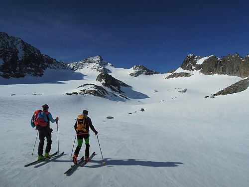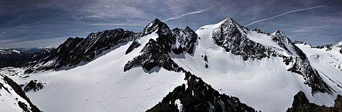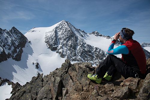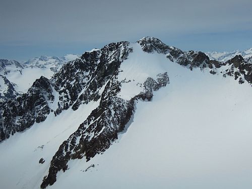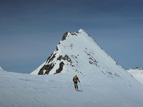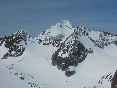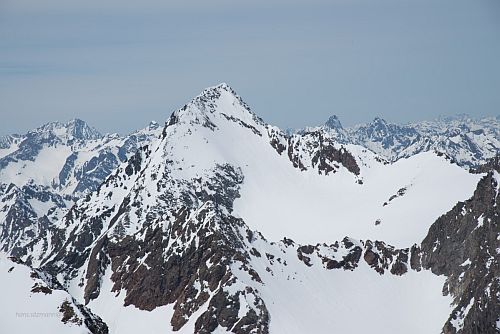 První řádnou túrou byl výstup na kopec Innere Sommerwand 3.122 m ze sedla Kräulscharte 3.069 m nedaleko od chaty. Naprosto pohodový lehký výlet zakončený lehkým lezením k vrcholovém kříži. Naše skupina obstála, Hans Sitzmann byl s námi spokojený. My s ním. Nečekal jsem, že by mi tento kurz měl plnit nějaké horské ambice. Túra tak byla poměrně příjemným překvapením s parádním rozhledem. Z vrcholu jsme mlsně koukli na okolní kopce a moje oči nemohly nespatřit elegantní pyramidu s úzkým proužkem ledovce vzpínajícím se až na hřeben. Ostliche Seespitze 3.416 m, absolutní skialpový cíl. Místní diamant! Ne nadarmo stojí v každém skialpovém průvodci na příčce nejvyšší. Stejně jako žena může být nádherná, absolutně líbivé křivky, podobně se Vám i tato hora okamžitě dostane do podvědomí. Tam chci a ten svah slyžovat! Nevím, zda jsem to byl již tehdy na vrcholu já, kdo Hansovi nenápadně naznačil, že bychom mohli následující den prásknout tuto nádheru. Až tak jsem v to ale nedoufal. Výstupový svah byl již na první pohled strmý a přeci jenom i v naši skupině byli slabší jedinci, pro které by to mohlo být již za hranicemi jejich možností. Nicméně nakonec se pánové horští vůdci umanuli, že naše skupina bude moci další den tento kopec prubnout. Parádička největší! Těšil jsem se jako malý kluk! Pořádný kopec! Žádný dětský brdek!