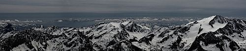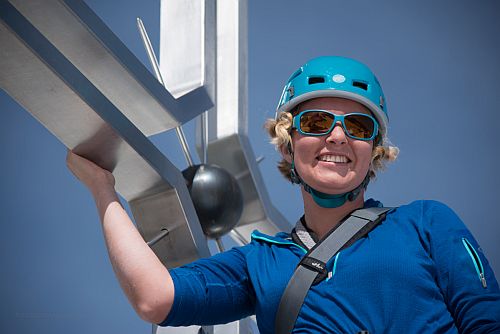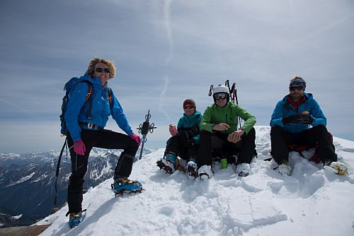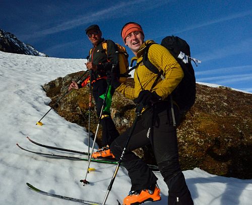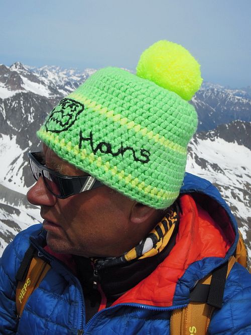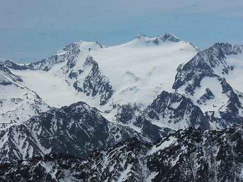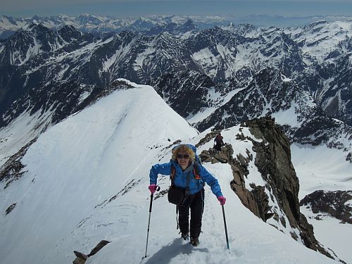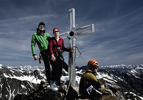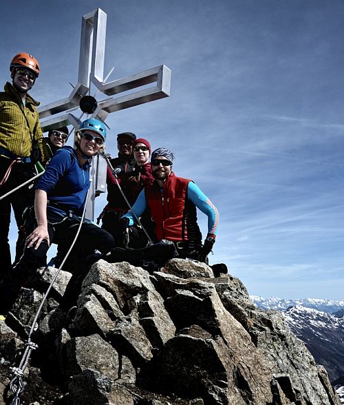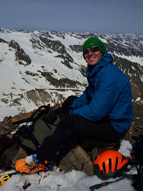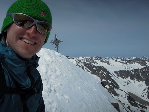 Ideální podmínka! Modrá obloha, lavinové riziko na stupni 1, výstupový svah tvrdý jako beton, závěrečné metry mají poctivých 35 – 40°! Nahoru jsme samozřejmě stoupali s haršajznami (stoupací mačky na skialpové lyže), bez kterých by to dnes nešlo. I bábovky z naše skupiny se statečně porvaly se strmými otočkami a bez ztráty kytičky (nikdo se v zatáčce nekontrolovaně nepřekulil do doliny) jsme vystoupali na vrcholový hřeben do sedla mezi Südliche 3.289 m a právě Ostliche Seespitze 3.416 m. Několik málo trhlin jsme viděli, ale tento ledovec Alpeiner Kräulferner rovněž z velké části dole odtál a trhlin se obávat nebylo třeba. Nahoře pod sedlem byl sníh ubitý větrem a těsně pod hřebenem koukal jen vodní led vlastního ledovce. Na lyžích jsme však došli až pod vrcholový severní hřeben. Já si chtěl vzít lyže s sebou na vrchol, ale Hans to z bezpečnostních důvodů zamítl, že žádný sjezd přímo z vrcholu nebude. S horským vůdcem se nediskutuje. Vrchol naprostá luxusní pohoda! Malý kovový symbolický vrcholový kříž, u kterého jsme všichni společně poseděli. Výhledy neopakovatelné. Alpy jako na dlani! Byl jsem moc rád, že na mne vyšla zrovna tato skupina! Nastala hodina H a čas sjezdu. Po hřebeni jsme se vrátili k lyžím, automaticky jsem si dopnul boty, nacvakl lyže a čekal na pokyn Hanse ke sjezdu, zatímco jsem sledoval kamarády přede mnou, jak zápolí s prvními strmými metry.