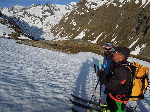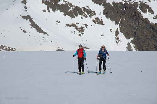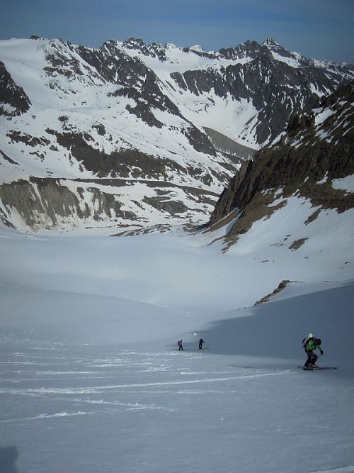 To už jsem profrčel kolem přihlížejících, nechal za zády jejich slova „Thomas, bremsen! – Tome, brzdi!“, dalších slov se jim nedocházelo. A stejně neočekávaně jako pád samotný jsem po saltu a následné krátké jízdě zaplul do jednoho z mála nepatrných měkkých dolíků ve svahu a nohami se o něj zastavil. Mazec! Největší! Moje překvapení toho všeho zdaleka nekončilo. Diváci s otevřenou pusou byli překvapeni, že jsem z tohoto představení odešel nijak nezraněn! „Tomas, der Sturz war wirklich grossartig! Bist du OK???“ „Jo, jsem v pohodě!“ Salto jsem při rychlosti toho pádu takřka nepostřehl. A jak vše neočekávaně začalo, vše podobně i skončilo! Diváci byli z toho představení více v šoku jak samotný aktér! Posbíral jsem po svahu sebe a lyže, opětovně jej nazul a na řádnou jistotu jako v lyžařské škole slyžoval zbývající strmou část ledovce. Každopádně se po pádu neochvějná jistota na lyžích hodně otřásla. Každopádně jsem nepochopil, kde nastala chyba a proč k ní došlo. Asi jsem do sněhových bochánků najel příliš rychle, možná krátce zkřížil lyže nebo prudký náraz od sněhové podložky vypnul na měkko nastavené vázání. Každopádně se vše událo absolutně neočekávaně a hrozivě rychle. Kategorie nekontrolovaný pád. S tím nejlepším koncem . A překvapivě pro ty, co mne znají, měl jsem na hlavě helmu! Lehkou horolezeckou polystyrénovou, tu s sebou na skialpové sjezdy často nosím. Po saltu jsem částečně dopadl i na hlavu, ale nic zásadního jsem nezaznamenal. Dole byl prvotřídní jarní firn.