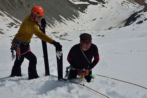 Konečně došla chvíle na mne a jako malý jsem se těšil, jak si tento sjezd užiji. Předem dodávám, že jsem toho v sezóně nalyžoval a naskialpoval tolik, jako nikdy předtím za sezónu. Odhadem jsem stál na lyžích 30 – 35 dní! Možná více. A tomu odpovídal i lyžařský projev. Takovou jistotu, sílu, rychlost, minimální strach na sjezdovce nebo ve volném terénu jsem dlouho neměl. A možná už nikdy nebudu mít. V ten moment jsem nahoře na nic jiného než samotný sjezd nemyslel. Pustil jsem to nejprve na ledové desce, pak ve sněhových bocháncích utemovaných větrem dost hodně na plné koule . Podotýkám, že svah má nahoře 35 – 40°! Žádný strach, absolutní jistota, která nějakou chybu nepředpokládala. Tři týdny jsem byl v Nepálu, nohy o něco zeslábly, ale nějaký rozdíl jsem nepociťoval. Luxusní sjezd!