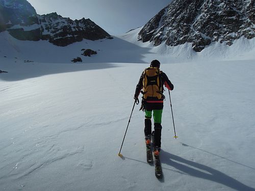 Najednou v jednom ze sněhových bochánků jsem ucítil, jak mi vycvaklo vázání a v krátkém sledu následovalo vázání druhé lyže a náhle jsem letěl svahem nekontrolovaně dolů . Vše se událo strašně rychle. Dobře si pamatuji ten náhlý šok z neočekávaného pádu, který jsem absolutně, absolutně nečekal a rozhodně nijak neplánoval! Zrovna v tom nejchujovějším – nejstrmějším místě! Do prdele třikrát! Asi dvě vteřiny trvalo, než mozek pobral moji chybu a vlastní pád (takto jsem dlouhé roky nespadl), ale to už jsem se bez lyží nekontrolovatelně vezl prudkým svahem dolů a nabíral se vzrůstajícím sklonem svahu, mizejícími sněhovými bochánky pod tělem, přímo úměrně na rychlosti. Výškové metry toho krásného strmého ledovce se hodně rychle ztrácely nad hlavou. To už mozek vyhodnotil, že musím „kurva“ nějak brzdit, v tom pádu jsem si dokázal chytnout obě hůlky a pomalu na ně naléhat (zkuste si cvičně zabrzdit pád na 40° svahu dvěma lyžařskými hůlkami…, ubrzdíte leda velké hov…) a hlavně za každou cenu zabránit tělu dostat se do nějakých rotací, jinak by to bylo hodně zlé. V té rychlosti stačí malé drncnutí o hranu nebo sponu lyžařské obuvi a je z Vás navíc akrobat! Pamatuji si, jak jsem si říkal: „Do prdele, tak to asi neubrzdím, ale mohl bych to kontrolovaně sjet na plochou část ledovce...“ Rozuměj 300 výškových metrů. Pěkně debilní představa. Myšlenku jsem ani nedokončil a následoval neplánovaný akrobatický prvek v podobě salta s efektním přistáním za plný počet bodů…