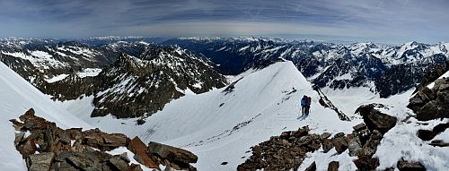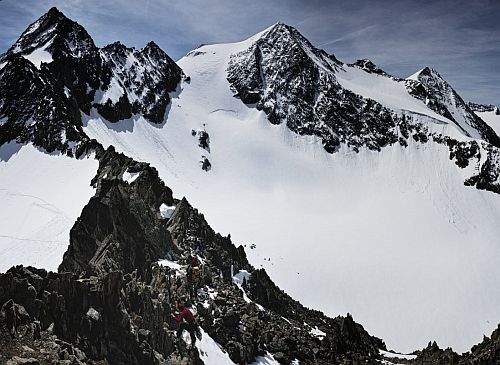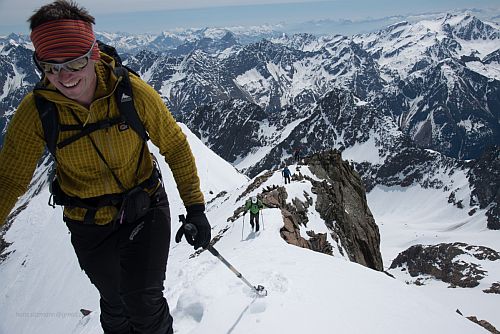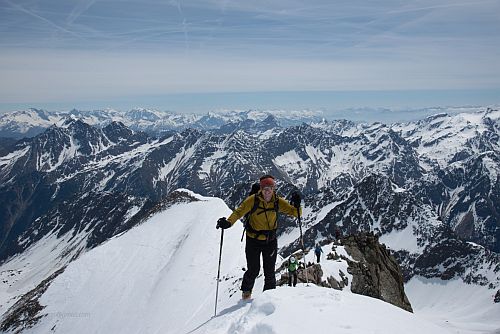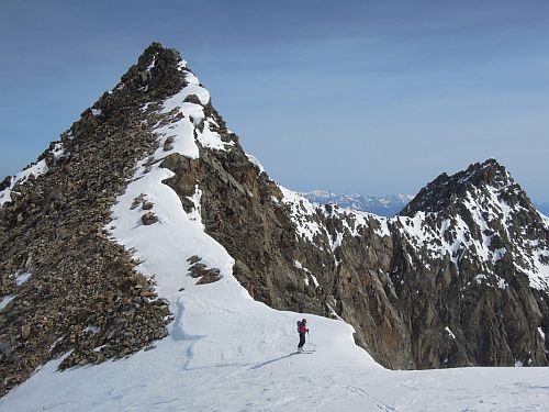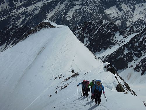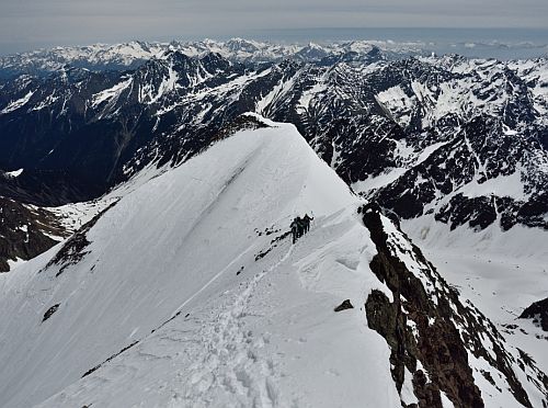 Poslední metry na vrchol Ostliche Seespitze. Podmínky k výstupu na tento vrchol musí být ideální. Na jedné straně optimální lavinová situace, na straně drahé led pokrytý sněhem.